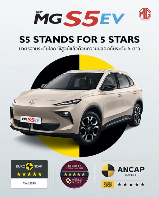 กรุงเทพฯ – 6 พฤศจิกายน 2568 – บริษัท เอสเอไอซี มอเตอร์ซีพี จำกัด และ บริษัท เอ็มจี เซลส์ (ประเทศไทย) จำกัด ผู้ผลิตและผู้จำหน่ายรถยนต์เอ็มจีในประเทศไทย อัพเดตล่าสุด NEW MG S5 EV ผ่านการรับรองมาตรฐานความปลอดภัยระดับสูงสุด 5 ดาวจาก ASEAN NCAP โปรแกรมทดสอบความปลอดภัยรถยนต์ระดับภูมิภาคอาเซียน ต่อจาก Euro NCAP และ ANCAP ส่งมอบความปลอดภัยให้ทั้งผู้ขับขี่ และผู้ใช้ถนนด้วยเทคโนโลยีความปลอดภัยระดับสูงมาตรฐานสากลที่ใส่มารอบคัน