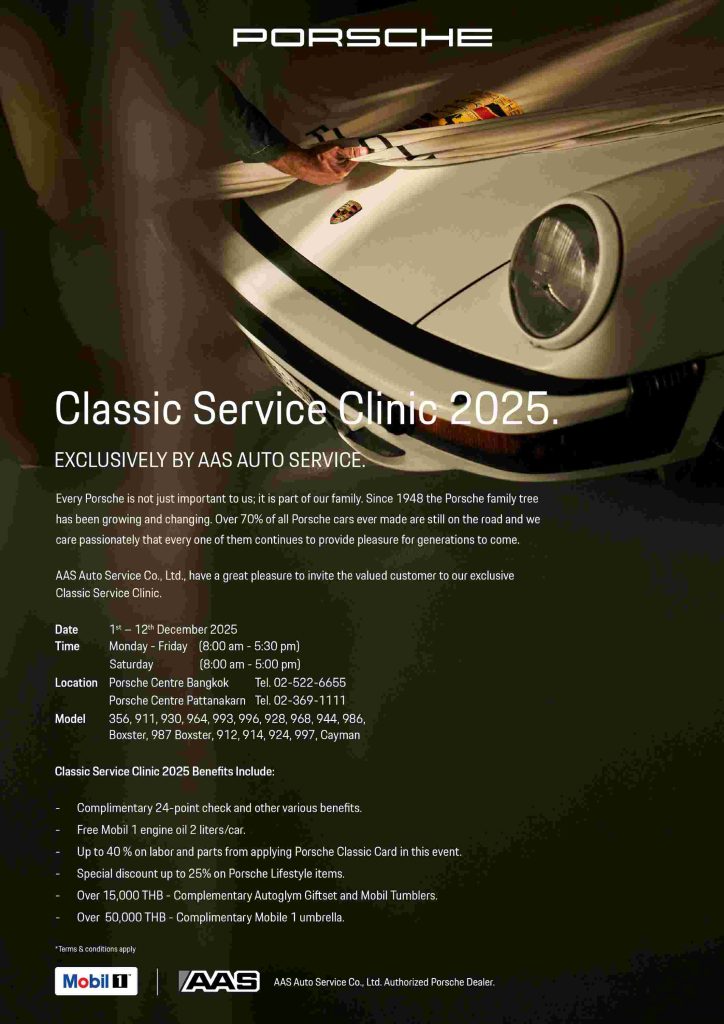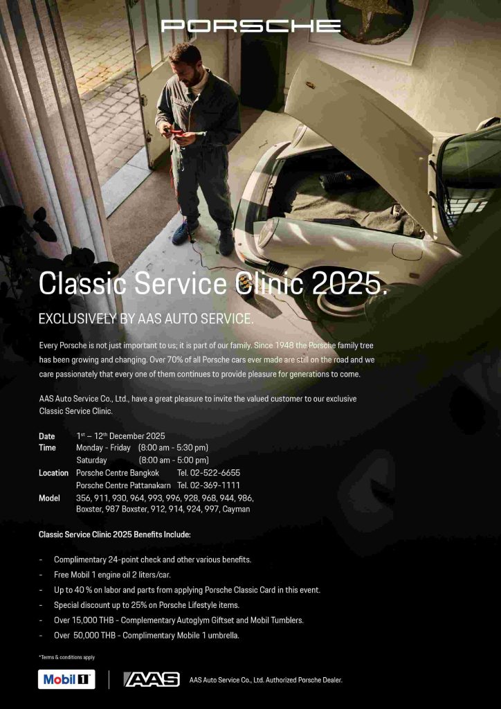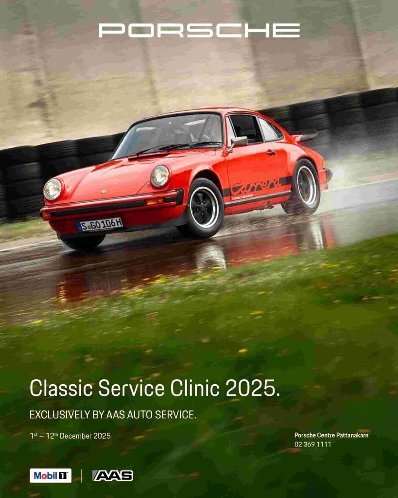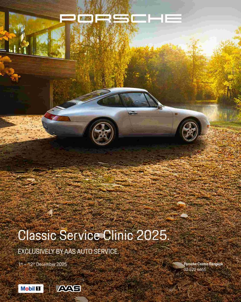 กรุงเทพฯ – เอเอเอส ออโต้ เซอร์วิส จำกัด ตัวแทนจำหน่ายรถยนต์ปอร์เช่อย่างเป็นทางการแห่งแรกในประเทศไทย และศูนย์บริการมาตรฐานจากโรงงานปอร์เช่ ประเทศเยอรมนี ขอเชิญผู้หลงใหลในเสน่ห์อันเหนือกาลเวลาของรถยนต์ปอร์เช่รุ่นคลาสสิก นำรถคู่ใจเข้ารับบริการตรวจเช็กสภาพในแคมเปญพิเศษ “Porsche Classic Service Clinic 2025” ครอบคลุมรุ่น 356, 911 (911, 912, 930, 964, 993, 996, 997), 928, 968, 914, 924, 944, 986 Boxster และ 987 Boxster/Cayman พร้อมรับบริการตรวจสภาพฟรี 24 จุด โดยไม่มีค่าใช้จ่าย* ด้วยทีม Certified Porsche Classic Technician ผู้เชี่ยวชาญระดับเหรียญทองมาตรฐานสากล การันตีที่สุดแห่งความเป็นเลิศด้านการดูแลรถยนต์คลาสสิกที่สร้างความไว้วางใจให้กับลูกค้ามาตลอด 10 ปี นับตั้งแต่การถูกแต่งตั้งให้เป็น Porsche Classic Partner แห่งแรกของโลก