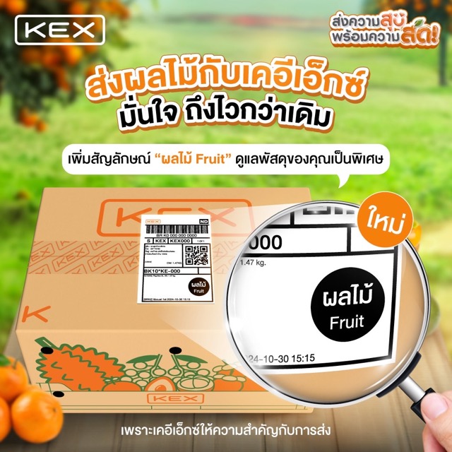 - ฉลากผลไม้ (Fruit icon) พร้อมความคุ้มครองทุกกล่อง: เพิ่มสัญลักษณ์ “ผลไม้ (Fruit)” บนลาเบลหน้าบรรจุภัณฑ์ เพื่อให้เจ้าหน้าที่คัดแยกและจัดส่งระมัดระวังเป็นพิเศษ มั่นใจได้ว่าส้มทุกลูกจะไม่มีรอยช้ำเสมือนไปเลือกซื้อเองที่สวน พร้อมเพิ่มความอุ่นใจยิ่งขึ้นเมื่อเลือกส่งส้มด้วย กล่องผลไม้ของ KEX ที่มาพร้อมความคุ้มครองประกันสูงสุด 2,000 บาท*