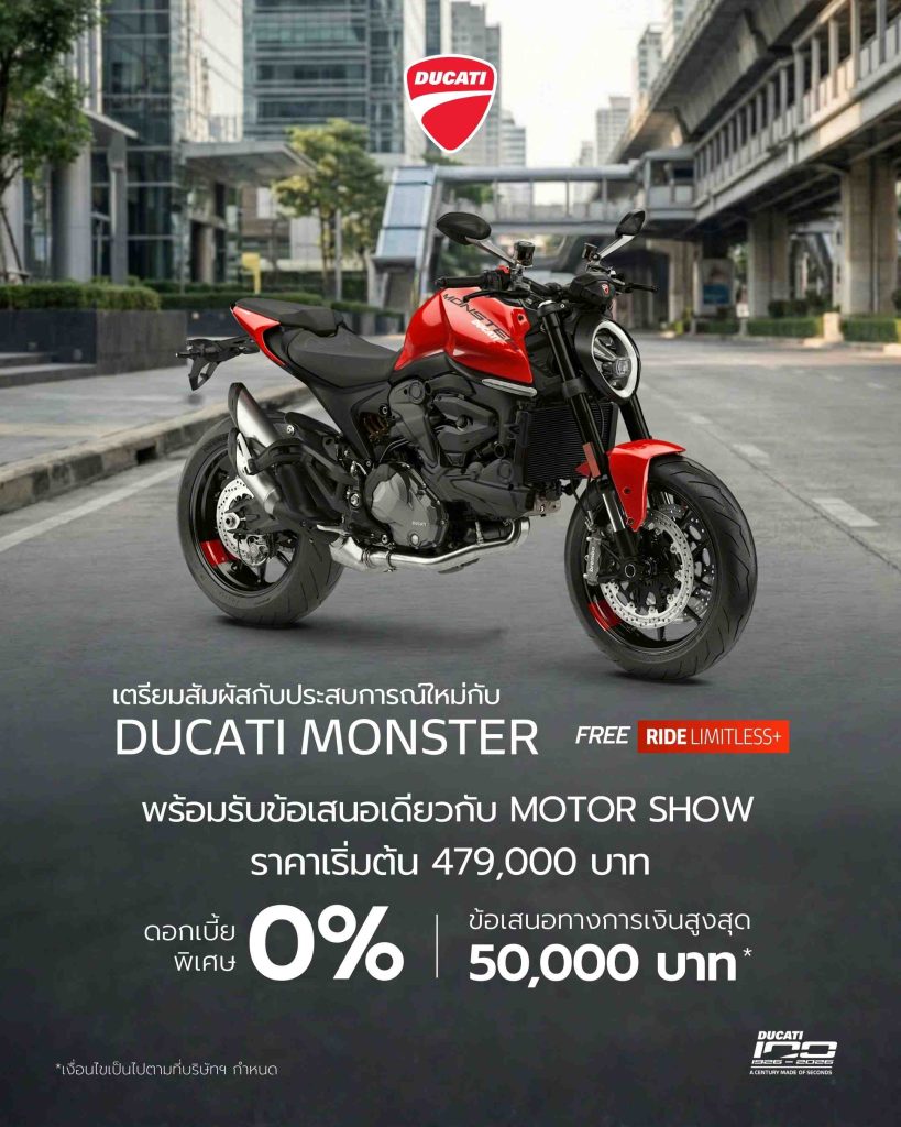 ไฮไลต์สำคัญของบูธปีนี้คือ New Monster+ สปอร์ตเน็กเก็ตไบค์ระดับไอคอน ที่กลับมาภายใต้แนวคิด “Everything you need, nothing more” ถ่ายทอดปรัชญาการออกแบบที่ตัดทอนสิ่งไม่จำเป็น เหลือไว้เพียง “แก่นแท้ของความสนุกในการขับขี่” มาพร้อมเครื่องยนต์ Ducati V2 รุ่นใหม่ ให้สมรรถนะ 111 แรงม้า 890 ซีซี โครงสร้างน้ำหนักเบาเพียง 175 กิโลกรัม และเทคโนโลยีอิเล็กทรอนิกส์ครบครัน ทั้ง Riding Modes, Traction Control, Wheelie Control, Quick Shift 2.0 และครั้งแรกสำหรับ Monster ที่มี Engine Brake control (EBC) พร้อมดีไซน์ใหม่ที่ยังคงเอกลักษณ์ Monster อย่างชัดเจน