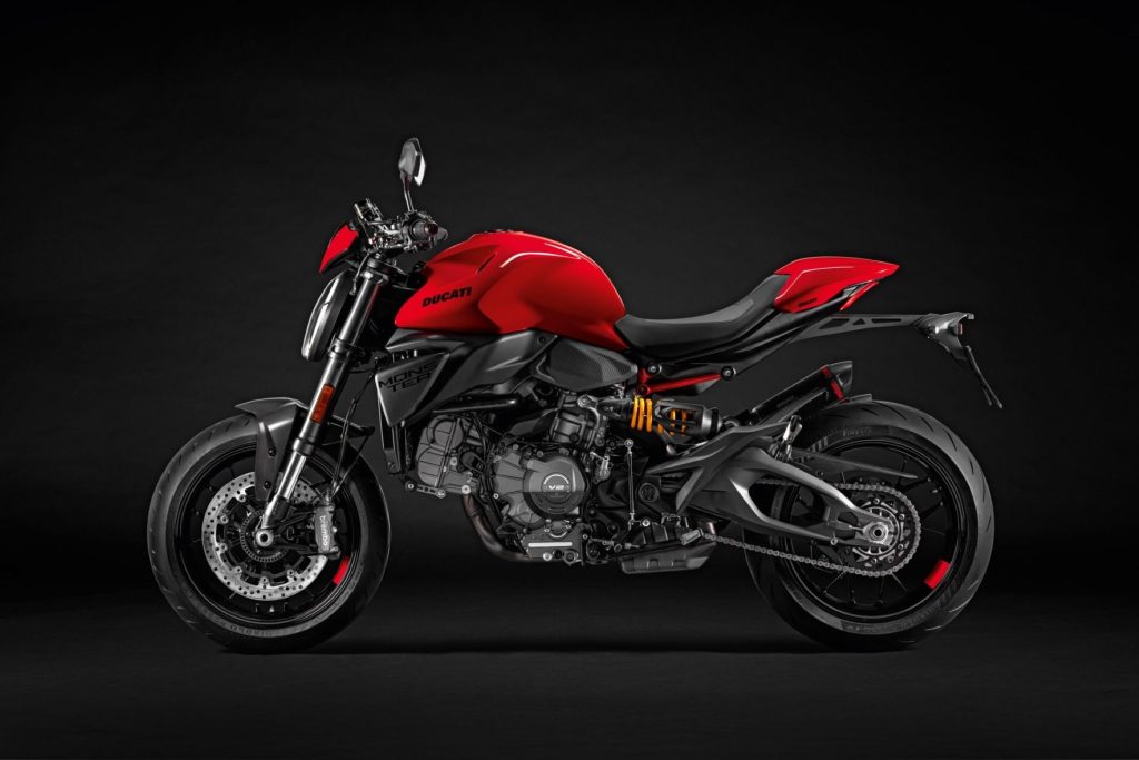 โครงสร้างสปอร์ต น้ำหนักเบา และควบคุมง่าย โดยใช้เฟรมแบบ Monocoque พร้อมสวิงอาร์มคู่ที่ได้รับแรงบันดาลใจจาก Panigale V4 ซี่งโครงสร้างนี้ช่วยให้ Monster ใหม่มีน้ำหนักเบาลงถึง 4 กิโลกรัม เมื่อเทียบกับรุ่นก่อนหน้า โดยมีน้ำหนักรวม 175 กิโลกรัม (ไม่รวมเชื้อเพลิง) Monster รุ่นใหม่มาพร้อมช่วงล่างที่ใช้ระบบกันสะเทือนหน้าจาก Showa Upside-down ขนาด 43 มม. และ โช้คหลัง Showa monoshock ปรับพรีโหลดได้ พร้อมระบบเบรกจาก Brembo ใช้ดิสก์หน้าคู่ขนาด 320 มม. พร้อมคาลิเปอร์ M4.32 radial และยาง Pirelli Diablo Rosso IV ขนาด 120/70 และ 180/55 มอบการยึดเกาะและความปลอดภัยสูงสุดสำหรับการใช้งานบนถนน