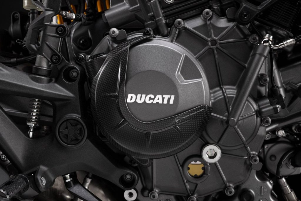เครื่องยนต์ Ducati V2 รุ่นล่าสุด ถือเป็นหัวใจสำคัญ ที่ถูกออกแบบมาให้มีการกระจายน้ำหนักที่สมดุลมากขึ้น ลดแรงสั่นสะเทือน ซึ่งช่วยให้การขับขี่มีความนุ่มนวลและควบคุมได้ง่าย เครื่องยนต์รุ่นใหม่นี้มีน้ำหนักเบาลง 5.9 กิโลกรัม เมื่อเทียบกับ Testastretta รุ่นก่อนหน้า และมาพร้อมระบบวาล์วแปรผัน IVT (Intake Variable Timing) ที่ช่วยให้เครื่องยนต์สามารถผสานความนุ่มนวลในรอบต่ำ แรงดึงในรอบกลาง และ พละกำลังในรอบสูง โดยให้กำลังสูงสุด 111 แรงม้า ที่ 9,000 รอบ/นาที และให้แรงบิด 70% ของแรงบิดสูดสุดตั้งแต่ที่ 3,000 รอบ/นาที และยังคงแรงบิด 80% ของแรงบิดสูงสุดไว้ให้ใช้งานตั้งแต่ 4,000 – 10,000 รอบ/นาที นอกจากนี้ผู้ขับขี่ยังสามารถสนุกกับการขับขี่ได้อย่างเต็มที่ ลดความกังวลเรื่องค่าบำรุงรักษา เพราะเครื่องยนต์ V2 รุ่นล่าสุด สามารถยืดระยะเวลา Maintenance Service ได้นานขึ้น โดยมีระยะการตรวจตั้งวาล์วที่ 45,000 กิโลเมตร ซึ่งถือเป็น 1 ในมาตรฐานที่ดีที่สุดในกลุ่มรถจักรยานยนต์ระดับเดียวกัน