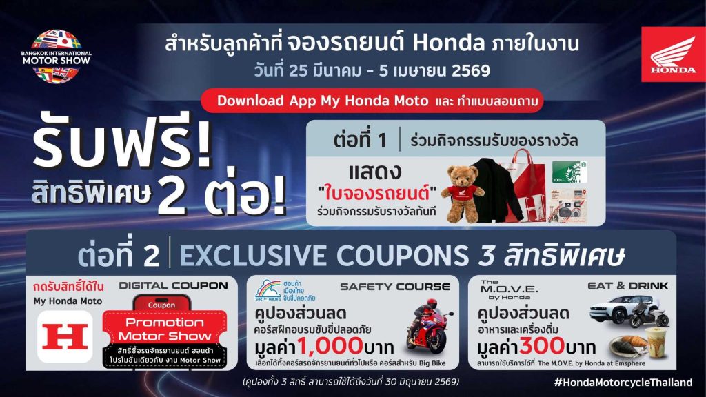 - Digital Coupon สิทธิ์ซื้อรถจักรยานยนต์ฮอนด้าโปรโมชั่นเดียวกับงาน Motor Show กดรับสิทธิ์ในคูปองส่วนลดสำหรับใช้จ่ายภายในงาน My Honda Moto (IOS: https://bit.ly/4urdJ5t Android: https://bit.ly/4b78vEi )