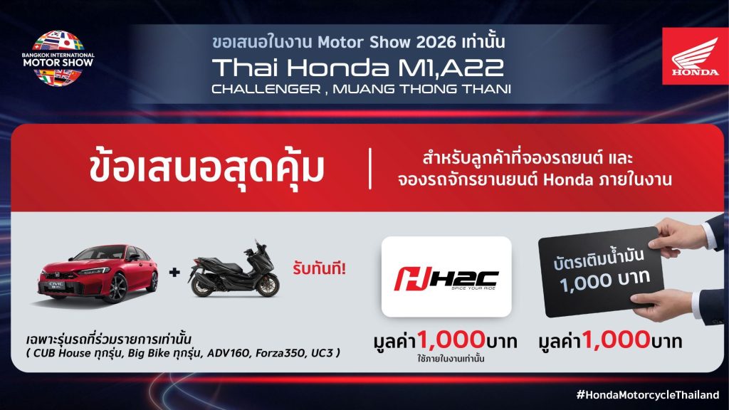 ฮอนด้า มอบข้อเสนอสุดคุ้มสำหรับลูกค้าที่จองรถยนต์ Honda ภายในงาน Motor Show 2026 เติมเต็มประสบการณ์การเดินทางในแบบ “Complete Your Honda Garage” ด้วยสิทธิพิเศษจากรถจักรยานยนต์ฮอนด้า ทั้งกิจกรรมลุ้นรับของรางวัลและคูปองสิทธิประโยชน์ รวมมูลค่าสูงสุดกว่า 1,300 บาท ระหว่างวันที่ 25 มีนาคม – 5 เมษายน 2569 ณ อาคารชาเลนเจอร์ฮอลล์ 1 อิมแพ็ค เมืองทองธานี