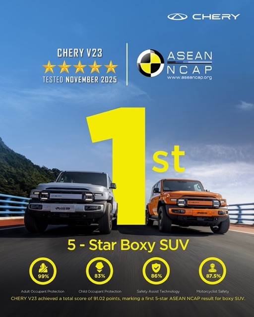 เชอรี (CHERY) ผู้นำด้านยานยนต์ระดับโลกที่มุ่งเน้นพัฒนาเทคโนโลยีและนวัตกรรมเพื่อมอบประสบการณ์การขับขี่ที่เหนือกว่า ประกาศความสำเร็จรถรุ่น V23 ผ่านการรับรองมาตรฐานความปลอดภัยระดับสูงสุด 5 ดาว จาก ASEAN NCAP โปรแกรมทดสอบความปลอดภัยรถยนต์ระดับภูมิภาคอาเซียน มอบความมั่นใจในความปลอดภัยทั้งผู้ขับขี่และผู้โดยสารในรถเชอรี V23