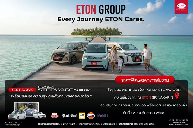 ETON GROUP ผู้นำอันดับหนึ่งด้านยนตรกรรมนำเข้าสำหรับครอบครัวและผู้บริหาร พร้อมศูนย์บริการมาตรฐานครบวงจร นำโดย คุณอัจฉรีย์ ตันติยันกุล ผู้อำนวยการฝ่ายขายและการตลาด ขนทัพรถยนต์เอนกประสงค์ ส่งท้ายปีเปิดบ้านจัดกิจกรรม “EVERY JOURNEY, ETON CARES” พร้อมส่งมอบความสุข…ทุกเส้นทางของครอบครัว ตอกย้ำความเป็นผู้นำรถยนต์นำเข้า มอบประสบการณ์เดินทางที่ดีที่สุด มอบสิทธิพิเศษและประสบการณ์เหนือระดับให้แก่ลูกค้า กับงานมหกรรมสุดยิ่งใหญ่แห่งปี ที่กำลังจะจัดขึ้นในวันที่ 12-14 ธันวาคม 2568 (3 วัน) ณ โชว์รูมอีตั้น สำนักงานใหญ่ สาขาศรีนครินทร์ พร้อมโปรโมชั่น สิทธิพิเศษ ข้อเสนอต่างๆ มากมาย