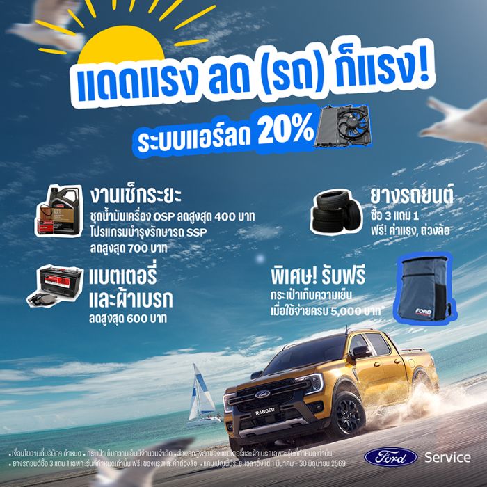 กรุงเทพมหานคร, ประเทศไทย, 8 เมษายน 2569 – ฟอร์ด ประเทศไทย มอบความมั่นใจและความปลอดภัยในช่วงเทศกาลวันหยุดฤดูร้อนที่ลูกค้ารถฟอร์ดต้องเดินทางไกล จัดแคมเปญบริการหลังการขายสุดพิเศษ ‘แดดแรง ลด(รถ) ก็แรง’ ชวนลูกค้านำรถเข้าตรวจสภาพให้พร้อมสู้ลมร้อน ด้วยข้อเสนอสุดคุ้ม อาทิ ส่วนลดอะไหล่ระบบแอร์ 20% ส่วนลดแพ็กเกจเช็กระยะสูงสุด 700 บาท โปรโมชันยาง 3 แถม 1 และรับฟรี กระเป๋าเก็บความเย็น ตั้งแต่วันที่ 1 มีนาคม – 30 มิถุนายน 2569 ที่ศูนย์บริการฟอร์ดทั่วประเทศ