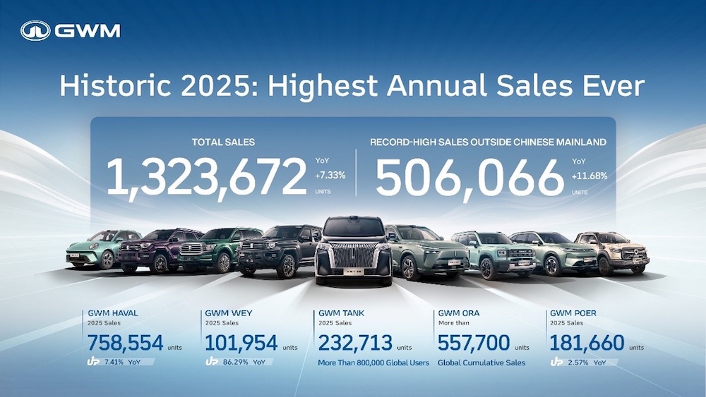 กรุงเทพฯ 14 มกราคม 2569 – GWM (Thailand) ยกระดับสู่การเป็นแบรนด์รถยนต์ที่มีผลิตภัณฑ์ครอบคลุมทุกประเภทพลังงาน ตอบโจทย์ผู้ใช้งานทุกกลุ่มทั่วโลก ภายใต้แนวคิด “All Scenarios – All Powertrains – All Users” พร้อมก้าวสู่การเป็นแบรนด์รถยนต์จีนที่คนไทยให้ความไว้วางใจสูงสุด และอันดับหนึ่งของแบรนด์รถยนต์จีนด้านบริการหลังการขายผ่านผลิตภัณฑ์ที่มีคุณภาพ เทคโนโลยีที่ล้ำสมัย และการดูแลลูกค้าด้วยความใส่ใจและโปร่งใส โดยในปี 2568 ที่ผ่านมา GWM ประสบความสำเร็จอย่างโดดเด่นด้วย ยอดจำหน่ายรวมทั่วโลก 1,323,672 คัน เติบโต 7.33% เมื่อเทียบกับปีที่ผ่านมา สร้างสถิติสูงสุดใหม่เป็นประวัติการณ์ ขณะที่ยอดจำหน่ายรถยนต์พลังงานใหม่ (NEV) อยู่ที่ 403,653 คัน เพิ่มขึ้น 25.44% ทำสถิติสูงสุดใหม่เช่นกัน และยอดจำหน่ายในตลาดต่างประเทศรวม 506,066 คัน เติบโต 11.68% เมื่อเทียบกับปีก่อน นับเป็นสถิติสูงสุดตลอดกาล สะท้อนถึงการเติบโตอย่างมั่นคงทั้งในเชิงปริมาณและคุณภาพบนเวทีโลก