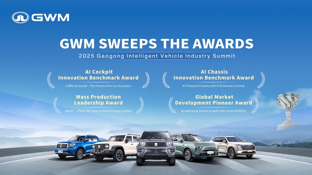 - รางวัล 2025 AI Chassis Innovation Benchmark: จากเทคโนโลยี AI Chassis ที่ยกระดับการควบคุมรถยนต์แบบองค์รวม ผสานระบบขับขี่อัจฉริยะ ห้องโดยสาร และการควบคุมยานพาหนะให้ทำงานร่วมกันได้อย่างไร้รอยต่อ ระบบสามารถประมวลผลแบบเรียลไทม์ ครอบคลุมทั้งการขับเคลื่อน 4 ล้อ เบรก การบังคับเลี้ยว และระบบกันสะเทือน มอบประสบการณ์ขับขี่ที่เหนือกว่าใน 4 ด้านหลัก ได้แก่ ความยืดหยุ่นสูง ความสบายเหนือระดับ การทำงานอัจฉริยะ และความปลอดภัยที่เพิ่มขึ้น ตอกย้ำบทบาทของ GWM ในการพลิกโฉมยานยนต์จากเพียง “พาหนะเพื่อการเดินทาง” สู่ “ยานยนต์อัจฉริยะในองค์รวม”