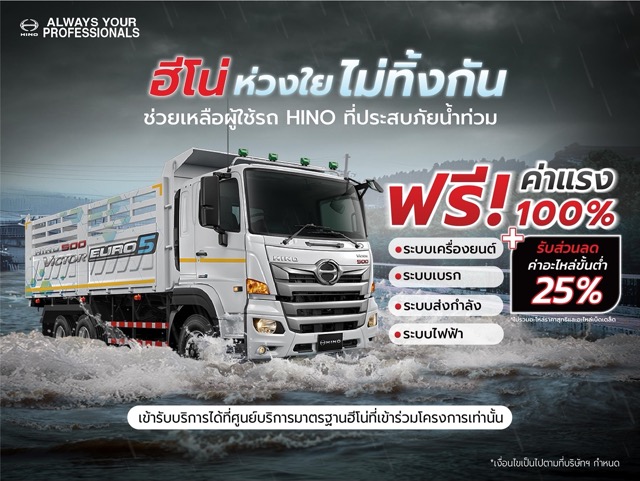 นอกจากการช่วยเหลือชุมชนแล้ว ฮีโน่ยังให้ความสำคัญกับการดูแลผู้ประกอบการและลูกค้าที่ใช้รถบรรทุกที่ได้รับผลกระทบจากน้ำท่วม จึงเดินหน้ามาตรการพิเศษด้านบริการหลัง การขายผ่านแคมเปญ “ฮีโน่ ห่วงใย ไม่ทิ้งกัน” บริการตรวจเช็กหลังน้ำท่วม ฟรี! ค่าแรง 100% เพื่อให้รถของลูกค้ากลับมาพร้อมใช้งานได้อย่างรวดเร็วและปลอดภัย ครอบคลุมการตรวจเช็กระบบสำคัญต่างๆ ได้แก่ ระบบเครื่องยนต์ ระบบเบรก ระบบส่งกำลัง และระบบไฟฟ้า พร้อมรับส่วนลดอะไหล่สำหรับอะไหล่ในกลุ่มผลิตภัณฑ์น้ำมันและเคมีภัณฑ์ ชุดติดตั้ง PTO อุปกรณ์ตกแต่ง และแบตเตอรี่ โดยทุกขั้นตอนดำเนินการโดยช่างเทคนิคมืออาชีพจากศูนย์บริการมาตรฐานฮีโน่ เพื่อให้รถกลับมาทำงานได้เต็มประสิทธิภาพและปลอดภัยสูงสุด ลูกค้าสามารถนำรถเข้ารับบริการได้ที่ศูนย์บริการมาตรฐานฮีโน่ทั่วประเทศที่เข้าร่วมโครงการ