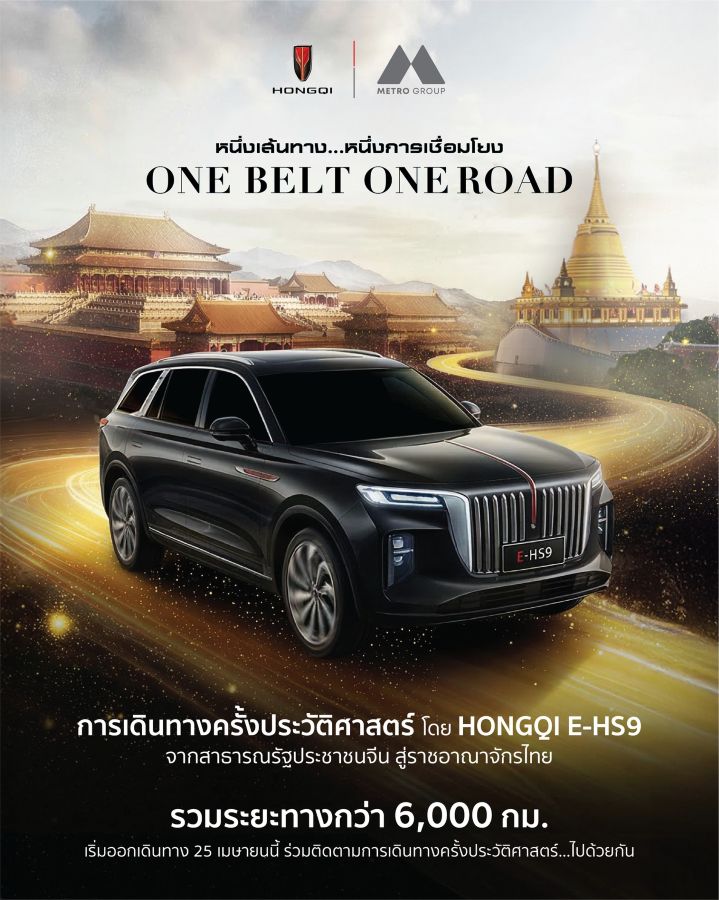 เมโทร กรุ๊ป ผู้จัดจำหน่ายรถยนต์สุดหรูระดับผู้นำ “หงษ์ฉี” (HONGQI) ในไทย โชว์บิ๊กไอเดียสร้างตำนาน “หงษ์ฉี” ปูทางก่อนเปิดตัวแบรนด์ในตลาดยานยนต์ไทย จัดกิจกรรมการเดินทางครั้งประวัติศาสตร์จากสาธารณรัฐประชาชนจีน ผ่าน สปป.ลาว สู่ประเทศไทย ด้วยรถยนต์ไฟฟ้า 100% “HONGQI E-HS9” ผ่านกิจกรรม “หนึ่งเส้นทาง…หนึ่งการเชื่อมโยง One Belt One Road” เริ่มต้นจาก “กำแพงเมืองจีน” และจบภารกิจที่ กรุงเทพมหานคร ประเทศไทย รวมระยะทางกว่า 6,000 กม.