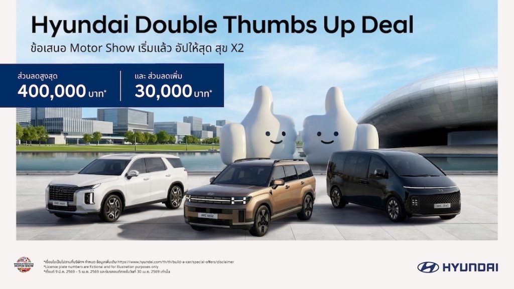 กรุงเทพฯ 10 มีนาคม 2569 — บริษัท ฮุนได โมบิลิตี้ (ประเทศไทย) จำกัด เปิดดีลแรง รับงานบางกอก อินเตอร์เนชั่นแนล มอเตอร์โชว์ ครั้งที่ 47 ปล่อยแคมเปญ “Hyundai Double Thumbs Up Deal อัปให้สุด สุข x2” จัดเต็มข้อเสนอแบบดับเบิล ด้วยส่วนลดสูงสุด 400,000 บาท* พร้อมส่วนลดเพิ่มอีก 30,000 บาท* สำหรับลูกค้าที่จองและรับรถยนต์ฮุนไดรุ่นที่ร่วมรายการ ให้ผู้ที่เล็งเป็นเจ้าของรถยนต์ฮุนไดในช่วงมอเตอร์โชว์ปีนี้ ได้รับความคุ้มค่าขั้นสุด โดยข้อเสนอสุดคุ้มนี้ สำหรับลูกค้าที่จองรถตั้งแต่วันนี้ – 5 เมษายน 2569 และรับรถภายในวันที่ 30 เมษายน 2569 ตามเงื่อนไขที่บริษัทกำหนด*
