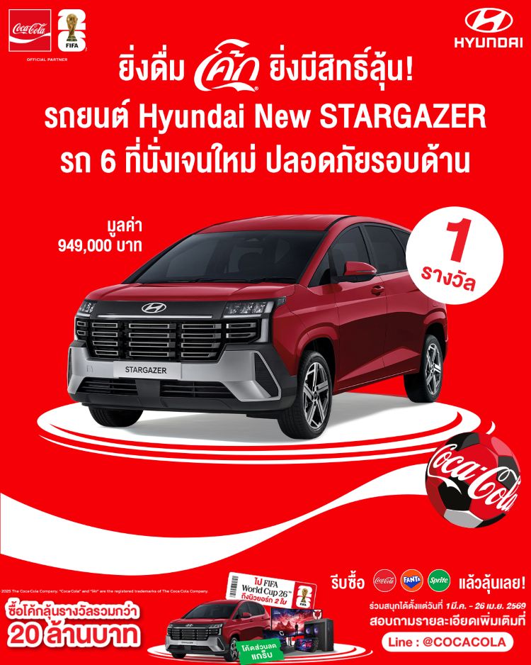 ต่อเนื่องจากประสบการณ์ดังกล่าว ฮุนไดยังนำเสนอ The new STARGAZER โฉมใหม่ล่าสุด ที่เตรียมประกาศราคาอย่างเป็ นทางการภายในงาน พร้อมจัดแสดง The new STARGAZER สีแดง รุ่น Limited Edition คันเดียวในประเทศไทย ซึ่งได้รับการคัสตอมพิเศษเพื่ อเป็นของรางวัลในแคมเปญความร่ วมมือกับโคคา-โคล่า “โค้กเปิดฟีลซ่าส์ พาลัดฟ้าเชียร์ FIFA World Cup 2026™” เพื่อร่วมสร้างสีสันและปลุกพลั งแฟนบอลไทยก่อนมหกรรมฟุตบอลระดั บโลกจะเริ่มต้น