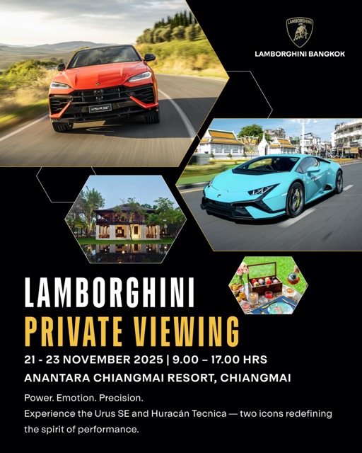 บริษัท เรนาสโซ มอเตอร์ จำกัด ตัวแทนจำหน่ายรถยนต์ลัมโบร์กินีอย่างเป็นทางการรายเดียวในประเทศไทย นำโดย อภิชาติ ลีนุตพงษ์ ประธานกรรมการ, ศักดิ์ นานา และ ม.ล.พลอยนภัส ลีนุตพงษ์ กรรมการ จัดงาน Lamborghini Private Viewing at Chiangmai เอาใจเหล่าแฟนพันธุ์แท้วัวกระทิงดุ ร่วมสัมผัสประสบการณ์การขับขี่ที่สุดแห่งขุมพลังไฮบริดในแบบเอ็กซ์คลูซีฟ อย่าง Lamborghini Urus SE ซูเปอร์เอสยูวีปลั๊กอินไฮบริดรุ่นแรกของแบรนด์ มาพร้อมกับเครื่องยนต์ทวินเทอร์โบ V8 ทรงพลังด้วยกำลังเครื่องรวม 800 CV พร้อมประสิทธิภาพและประสบการณ์การขับขี่ที่ดีที่สุดในคลาสตามแบบฉบับลัมโบร์กินี และ The Last NA รุ่นไอคอนิก ระดับตำนาน อย่าง Lamborghini Huracan Tecnica รุ่นที่ขับเคลื่อนด้วยเครื่องยนต์ V10 (NA) สุดคลาสสิกของแบรนด์ ซึ่งนับเป็นการเปิดประสบการณ์การขับขี่ครั้งแรกที่ภาคเหนือ ระหว่างวันที่ 21-23 พฤศจิกายน 2568 ณ รีสอร์ท อนันตรา เชียงใหม่