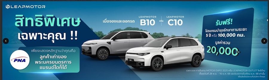 - สิทธิพิเศษสำหรับ ลูกค้าเก่าที่เคยออกรถยนต์จากทุกแบรนด์ภายใต้กลุ่มพระนครยนตรการ เมื่อจองและออกรถ Leapmotor C10 หรือ Leapmotor B10