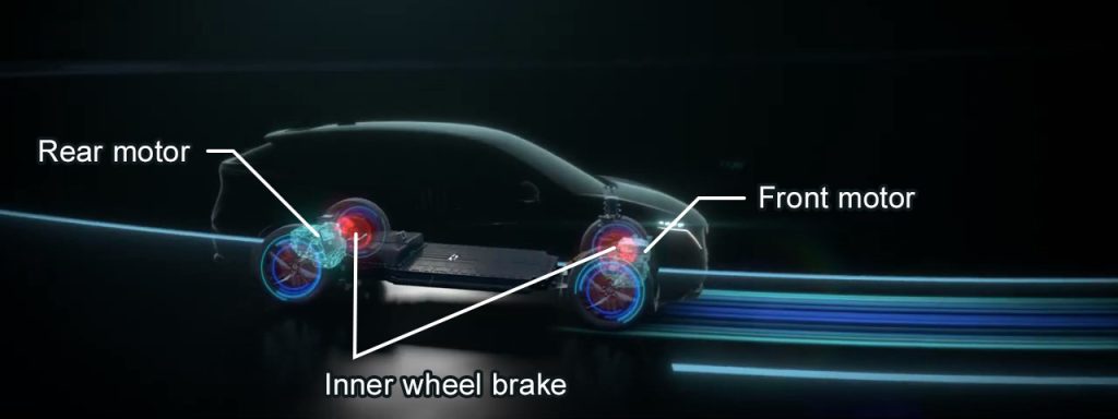 อี-ฟอร์ซ รับมือกับความท้าทายนี้ได้อย่างมีประสิทธิภาพ ด้วย มอเตอร์ไฟฟ้าคู่ หน้า–หลัง ที่ทรงพลัง ซึ่งทำงานอย่างอิสระเพื่อคำนวณแรงขับเคลื่อนที่เหมาะสมกับการเลี้ยว การเร่ง และการเบรกตามการควบคุมของผู้ขับ พร้อมระบบควบคุมเบรกซ้าย-ขวาอย่างแม่นยำ เพื่อให้แรงขับเคลื่อนทั้ง สี่ล้อทำงานได้เต็มประสิทธิภาพ แตกต่างจากระบบขับเคลื่อนสี่ล้อแบบทั่วไปที่จำกัดการกระจายแรงไว้ที่ 50:50 โดย อี-ฟอร์ซ สามารถปรับแรงขับเคลื่อนระหว่างล้อหน้า และหลังได้อย่างอิสระ ตั้งแต่ 100:0 ถึง 0:100 และเมื่อผสานกับระบบควบคุมเบรก ล้อซ้ายและขวาก็สามารถปรับแรงได้ด้วยความเร็วและความแม่นยำสูง มอบการควบคุมที่เหนือระดับในทุกเส้นทาง