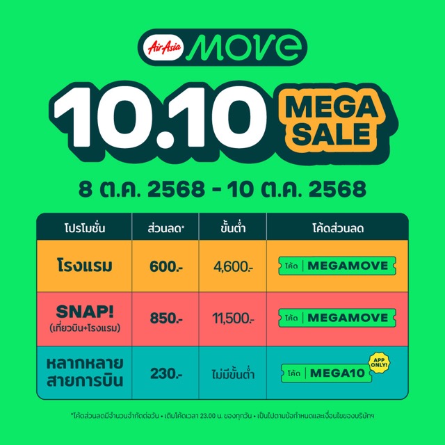 เพื่อตอบโจทย์ความต้องการเดินทางในช่วงไฮซีซัน AirAsia MOVE เปิดตัวแคมเปญ 10.10 Mega Sale ระหว่างวันที่ 8–10 ตุลาคม 2568 พร้อมดีลพิเศษ ดังนี้: