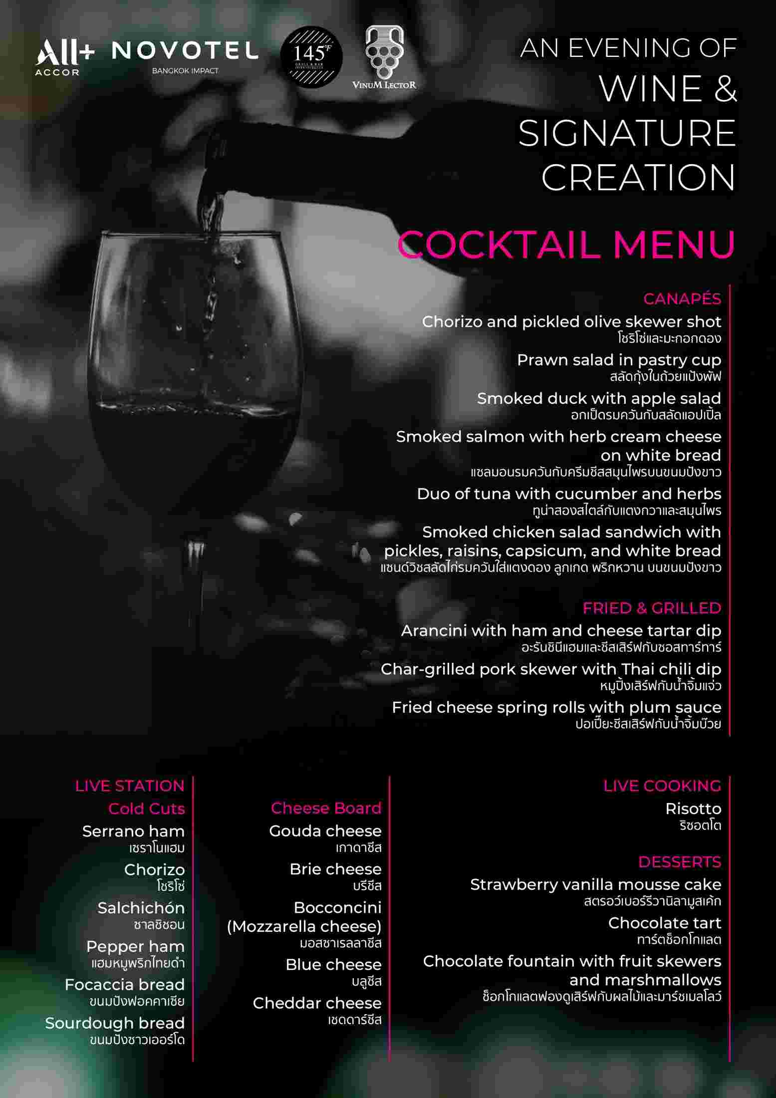 1โรงแรมโนโวเทล กรุงเทพ อิมแพ็ค ขอเชิญทุกท่านร่วมสัมผัสประสบการณ์ค่ำคืนพิเศษ “An Evening of Wine & Signature Creation” ในวันเสาร์ที่ 29 พฤศจิกายน 2568 เวลา 18.30 น. จัดงาน ณ 145 กริล แอนด์ บาร์ (145°F Grill & Bar) ร้านอาหารสุดเก๋ ที่นำเสนอเมนูนานาชาติและเมนูสเต็กชั้นเยี่ยมท่ามกลางบรรยากาศผ่อนคลาย เหมาะสำหรับการพบปะ พูดคุย และใช้เวลาค่ำคืนอย่างมีรสนิยม