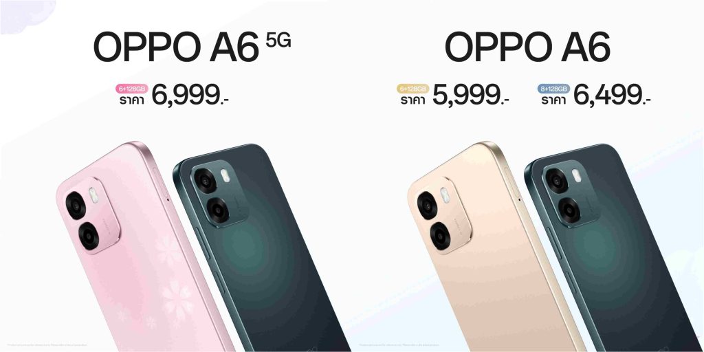 • OPPO A6 5G (6+128GB) มาใน 2 สี ได้แก่ สีชมพู Sakura Pink และสีน้ำเงิน Sapphire Blue วางจำหน่ายในราคา 6,999 บาท