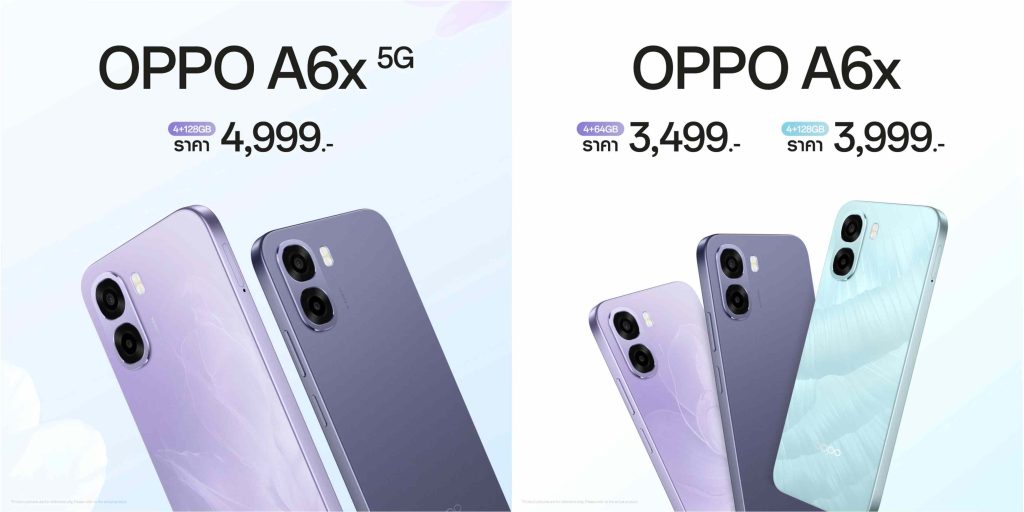 • OPPO A6x มาพร้อม 2 ความจุ ได้แก่ OPPO A6x (4+64GB) OPPO A6x (4+128GB) พร้อมมาใน 3 สี ได้แก่ สีฟ้า Ice Blue, สีม่วง Violet Purple และสีม่วง Plum Purple วางจำหน่ายในราคาเริ่มต้นเพียง 3,499 บาท