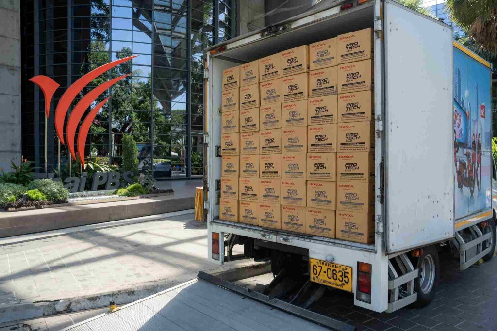 การส่งมอบน้ำมันเครื่องครั้งนี้ ดร.อารักษ์ พรประภา ประธาน บริษัท ไทยฮอนด้า จำกัด เป็นผู้มอบให้ไทยพีบีเอส โดย นายสมชัย พุทธจันทรา รองผู้อำนวยการ ส.ส.ท. ด้านสร้างสรรค์เนื้อหา เป็นผู้รับมอบ น้ำมันเครื่องเครื่องกว่า 200 ลัง จำนวน 2,400 ขวด และได้ทำการส่งตรงถึงสำนักงานคณะกรรมการการอาชีวศึกษา เมื่อวันที่ 7 ธันวาคมนี้ ที่ผ่านมา ณ วิทยาลัยเทคนิคหาดใหญ่ เพื่อกระจายให้กับศูนย์ฯ ต่างๆ ในจังหวัดสงขลา กว่า 50 แห่ง ซึ่งน้ำมันเครื่องเหล่านี้ ถือเป็นส่วนสำคัญ ที่จะช่วยให้เด็กๆ อาชีวศึกษา ซ่อมรถจักรยานยนต์ ให้ผู้ประสบภัยนำมาใช้งานในชีวิตประจำวัน หรือ ประกอบอาชีพ ต่อไปได้