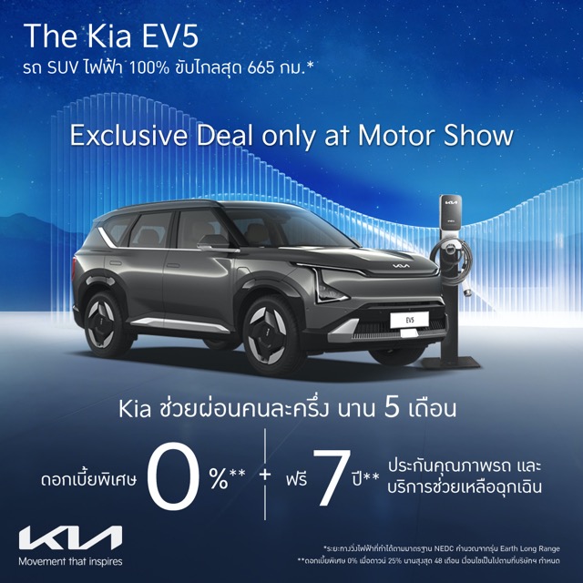 [2] อัตราดอกเบี้ยพิเศษ 0% สำหรับรุ่น The Kia EV5 (Air, Earth Long Range, Earth Exclusive AWD, GT-Line) พร้อมดาวน์ 25% สำหรับระยะเวลาผ่อนชำระ 48 เดือน  เฉพาะการจัดเช่าซื้อกับธนาคารที่เข้าร่วมรายการ ได้แก่บริษัท กสิกรลีสซิ่ง จํากัด ธนาคารกรุงศรีอยุธยา จำกัด (มหาชน) ธนาคารเกียรตินาคินภัทร และธนาคารทหารไทยธนชาต จำกัด (มหาชน) *กรณีลูกค้าจัดไฟแนนซ์ ธนาคาร/ลีซซิ่งอื่นจะไม่ได้รับการสนับสนุนด้านประกันภัย