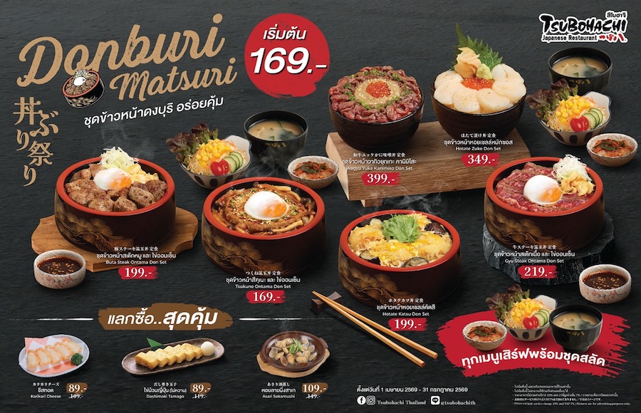 สำหรับเทศกาล “Donburi Matsuri” ในครั้งนี้ สึโบฮาจิเน้นการนำเสนอเมนู “ข้าวด้ง” ที่เครื่องแน่นล้นชามอันเป็นเอกลักษณ์ของฮอกไกโด โดยทุกเมนูจะเสิร์ฟเป็นชุดพร้อมสลัดผักสดและซุปมิโซะร้อนๆ เพื่อสุขภาพที่ดีในทุกมื้ออาหาร โดยไฮไลท์ 6 เมนูที่ไม่ควรพลาด ได้แก่: