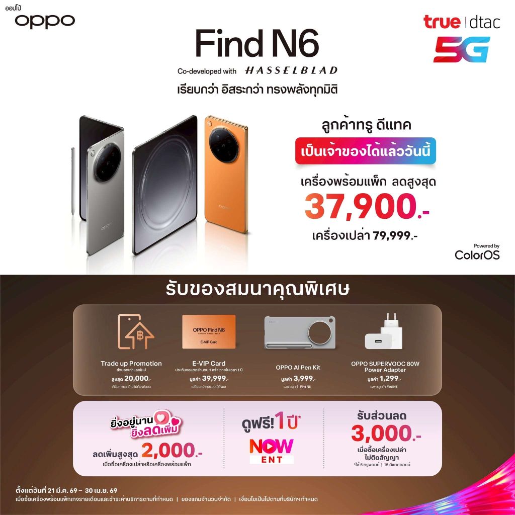 พบกับประสบการณ์ที่เรียบกว่า อิสระกว่า ทรงพลังทุกมิติ OPPO Find N6 สมาร์ตโฟนจอพับรุ่นใหม่ล่าสุด พร้อมโปรโมชันพิเศษจากทรู! ในราคาสุดคุ้ม เริ่มต้นเพียง 42,099 บาท
