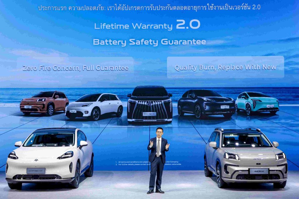 • ความเชื่อมั่นขั้นสูง (Advanced Assurance): ขับเคลื่อนด้วยคุณภาพอันดับ 1 จาก J.D. Power โดยมีไฮไลต์สำคัญคือการยกระดับความปลอดภัยขั้นสูงสุดด้วยการอัปเกรดการรับประกันเป็น Lifetime Warranty 2.0 ภายใต้แนวคิด “ความมุ่งมั่นไร้กังวลเรื่องอัคคีภัย และคำมั่นสัญญาการรับประกันเต็มรูปแบบ” (Zero Fire Concern, Full Guarantee Promise) ซึ่งถือเป็นการรับประกันขั้นสูงสุดของแบรนด์ โดย GAC ให้คำมั่นสัญญาว่า หากเกิดเหตุไฟไหม้ที่มีสาเหตุมาจากคุณภาพของแบตเตอรี่ บริษัทฯ จะทำการเปลี่ยนรถยนต์คันใหม่ให้แก่ลูกค้าทันที รวมถึงการรับประกันตลอดอายุการใช้งานที่ครอบคลุมชิ้นส่วนหลักทั้ง แบตเตอรี่ขับเคลื่อน มอเตอร์ขับเคลื่อน และกล่องควบคุมมอเตอร์ไฟฟ้า เพื่อมอบความอุ่นใจสูงสุดในทุกการเดินทาง