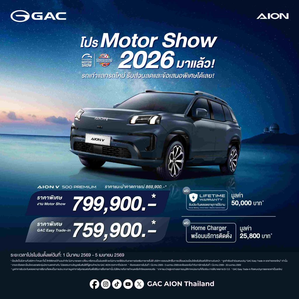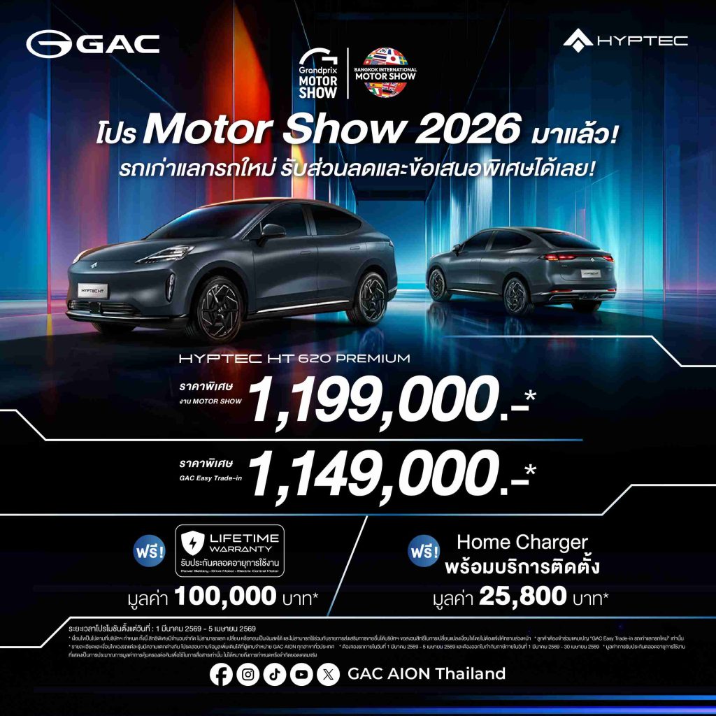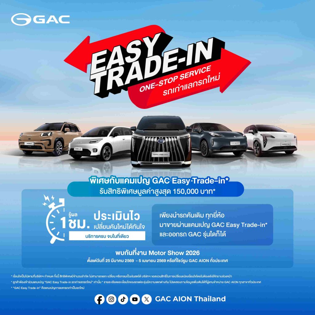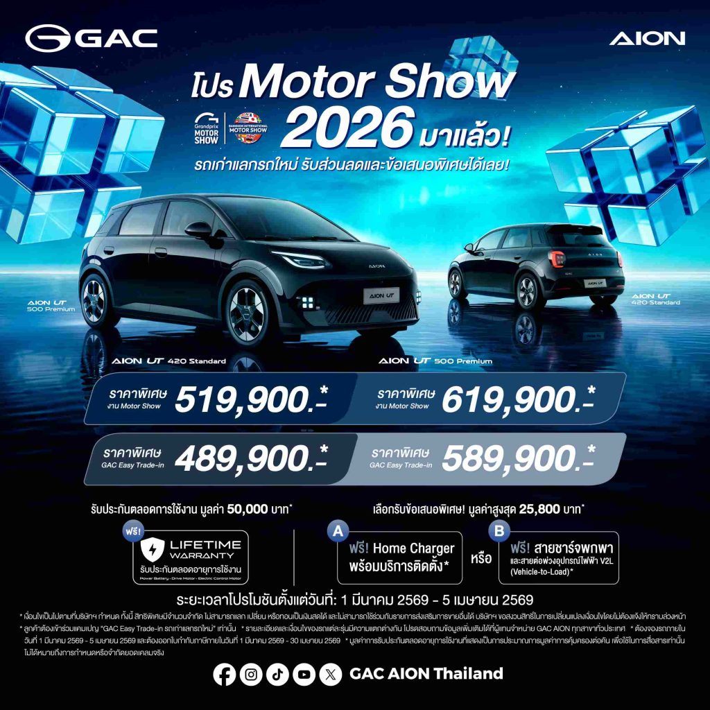 สำหรับลูกค้าที่สนใจสัมผัสประสบการณ์แห่งอนาคตและนวัตกรรมยานยนต์ไฟฟ้าระดับโลกจาก GAC สามารถเข้ามาชมรถคันจริงและร่วมทดลองขับรถยนต์พลังงานใหม่ทุกรุ่นจาก GAC ได้ที่บูธ GAC AION Thailand (บูธ A20) ณ อาคารชาเลนเจอร์ฮอลล์ 1 อิมแพ็ค เมืองทองธานี ตั้งแต่วันที่ 25 มีนาคม – 5 เมษายน 2569 หรือเข้าร่วมแคมเปญ Trade-in และสัมผัสตัวจริงได้ที่โชว์รูม GAC AION ทั่วประเทศ