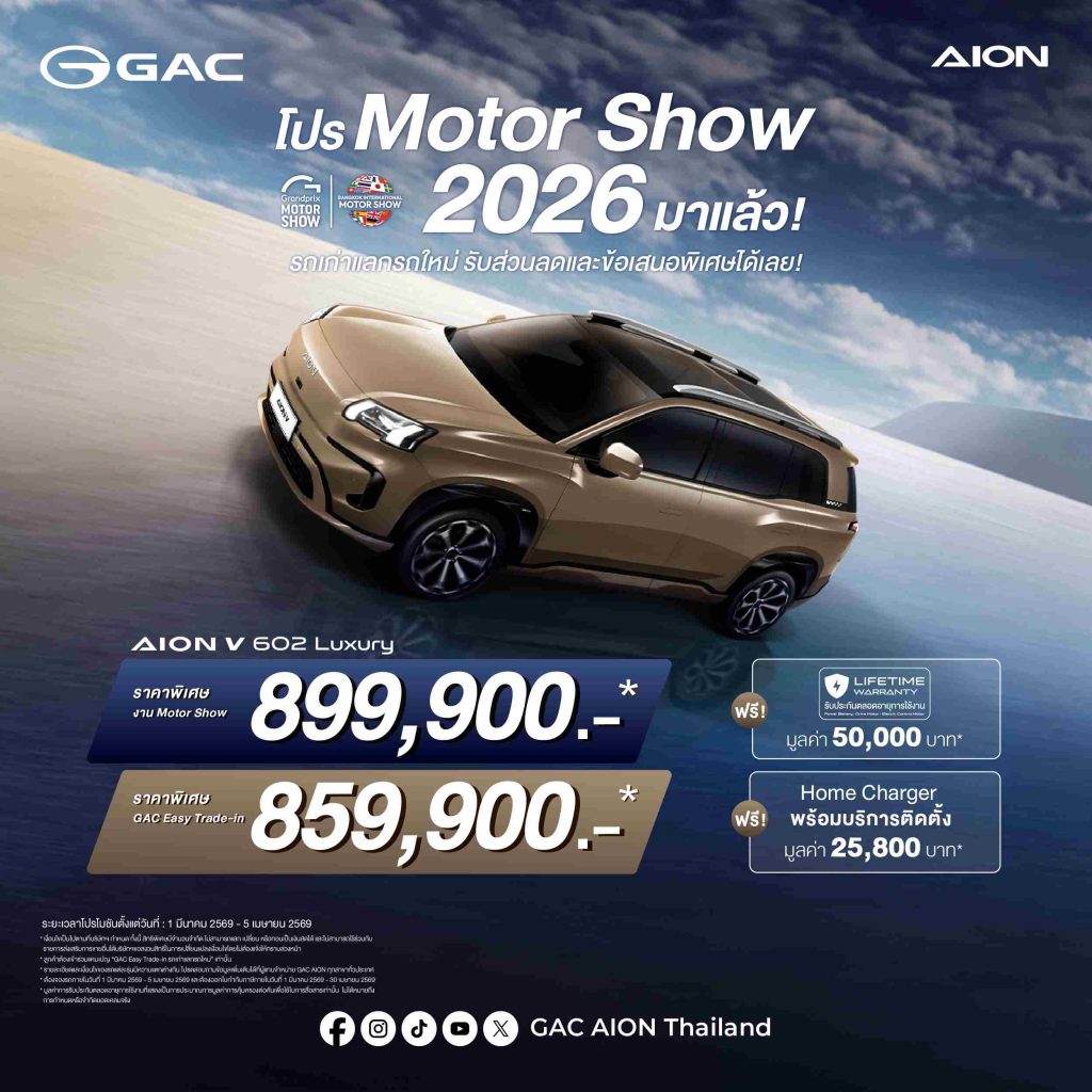 GAC AION เดินหน้ากลยุทธ์ Thailand Action 2.0 ในงาน Motor Show 2026 พร้อมแคมเปญครบทุกไลน์อัพ และ GAC Easy Trade-in มอบส่วนลดสูงสุด 150,000 บาท