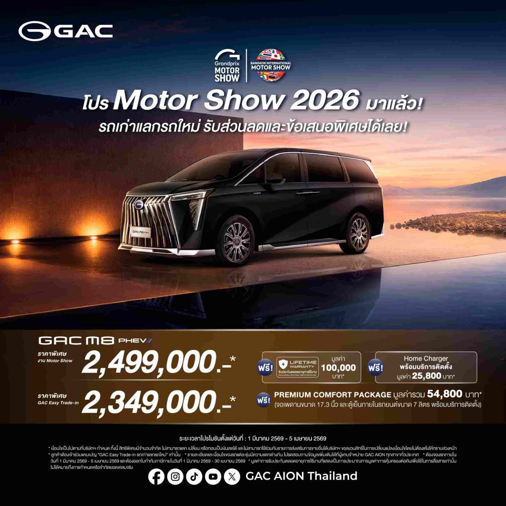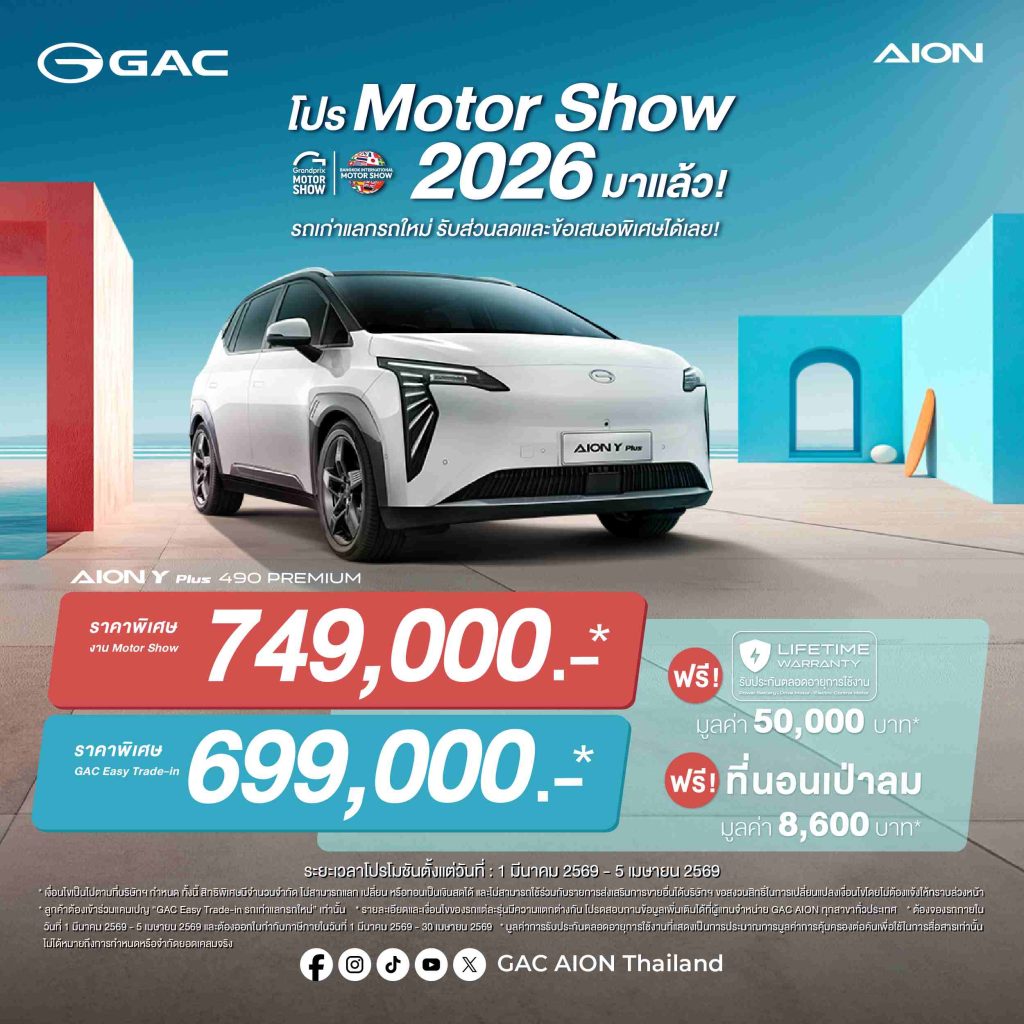 (กรุงเทพฯ, 24 มีนาคม 2569) – GAC AION Thailand ประกาศความยิ่งใหญ่ในงาน Bangkok International Motor Show 2026 ขนทัพยนตรกรรมพลังงานทางเลือกใหม่จัดแสดงแบบเต็มพิกัด โดยในปีนี้มาพร้อมไฮไลต์สำคัญทั้งทิศทางการดำเนินธุรกิจระดับโลก การยกระดับบริการหลังการขาย และการจัดเต็มโปรโมชันสุดเอ็กซ์คลูซีฟ เพื่อสร้างระบบนิเวศยานยนต์ไฟฟ้าที่สมบูรณ์แบบและยั่งยืนในประเทศไทย