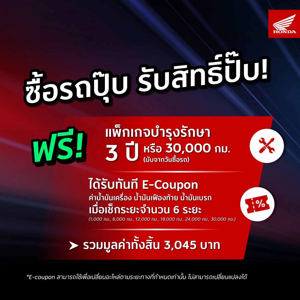 - รับ E-Coupon รวมมูลค่า 3,045 บาท สำหรับค่าน้ำมันเครื่อง น้ำมันเฟืองท้าย และ น้ำมันเบรกเมื่อเข้ารับบริการตามระยะที่กำหนด จำนวน 6 ระยะ ได้แก่ 1,000 กิโลเมตร, 6,000 กิโลเมตร, 12,000 กิโลเมตร, 18,000 กิโลเมตร, 24,000 กิโลเมตร และ 30,000 กิโลเมตร