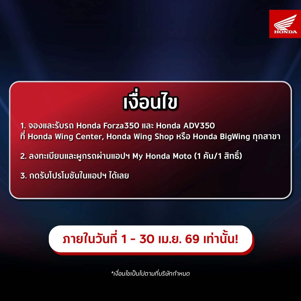 - จองและรับรถ New Honda Forza350 หรือ New Honda ADV350 ที่ Honda Wing Center และ Honda BigWing ทุกสาขา ภายในวันที่ 1-30 เมษายน 2569