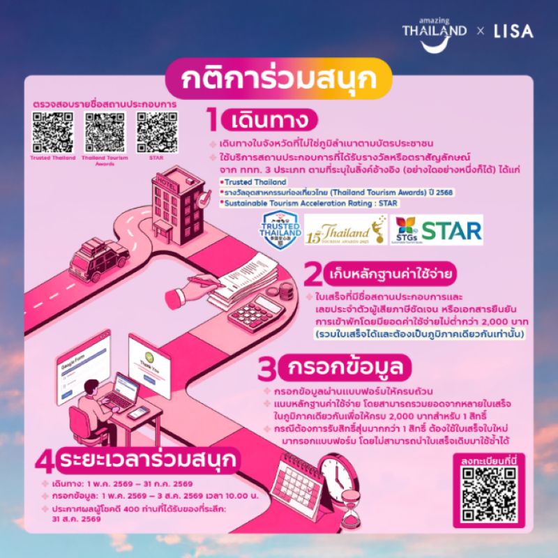 การประกาศรางวัล: วันที่ 31 สิงหาคม 2569 (รวมประกาศครั้งเดียวทั้งหมด 400 รางวัล) ผ่านช่องทาง Facebook: Amazing Thailand