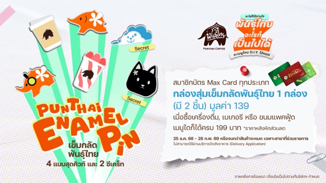 รับฟรี! กล่องสุ่มเข็มกลัดพันธุ์ไทย 1 กล่อง (2 ชิ้น) มูลค่า 139.- เมื่อซื้อเครื่องดื่ม เบเกอรี หรือ ขนมแพคฟู้ด เมนูใดก็ได้ ครบ 199 บาท/ใบเสร็จ (หลังหักส่วนลด) สิทธิพิเศษสำหรับสมาชิก Max Card ทุกประเภท