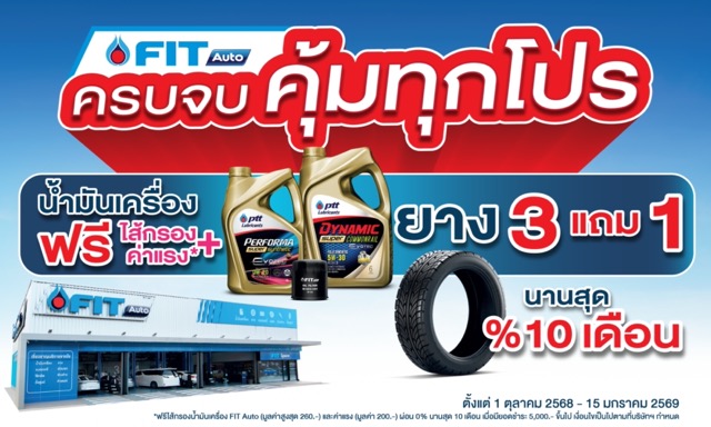 ยางซื้อ 3 แถม 1 จากแบรนด์ที่ร่วมรายการ (Goodyear, Yokohama รุ่น AE51 และ G056, Deestone และ Westlake) และรับโปรแกรมดูแลยาง FIT Care ครอบคลุมตลอด 2 ปี หรือ 50,000 กม. รวมบริการตั้งศูนย์ 2 ครั้ง, สลับยาง-ถ่วงล้อ 5 ครั้ง, เติมลมไนโตรเจนไม่จำกัด, และปะยางแบบแทงไหมฟรี เมื่อเปลี่ยนยางครบ 4 เส้นที่ FIT Auto - เปลี่ยนถ่ายน้ำมันเครื่อง PTT Lubricants เริ่มต้น 690 บาท ฟรี! ไส้กรองน้ำมันเครื่องและค่าแรง