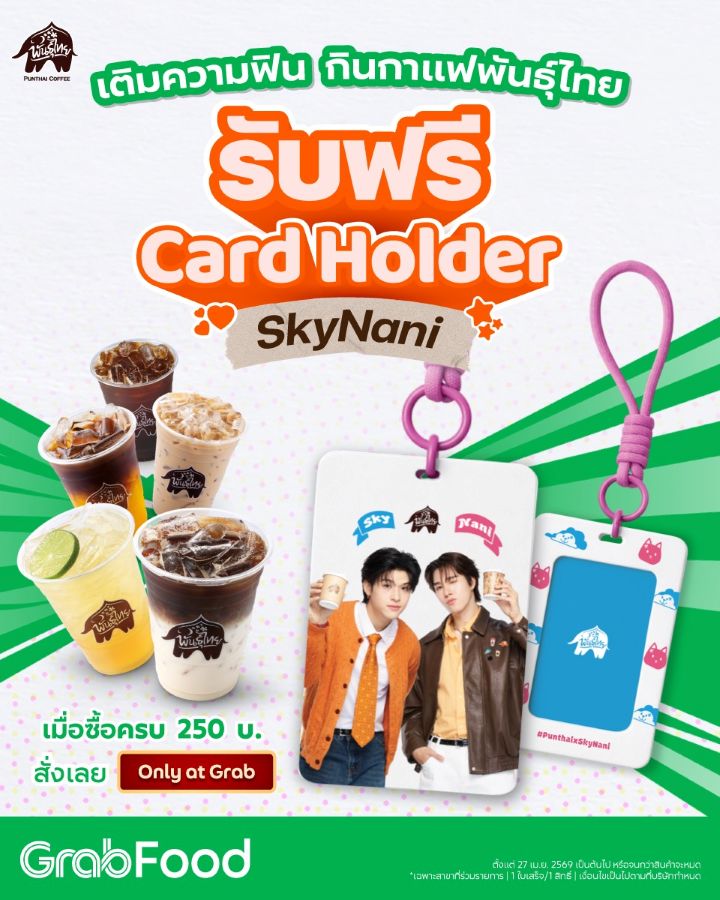เริ่มต้นความฟินด้วยไอเทมสะสมสุดคิวท์ เพียงสั่งเครื่องดื่มพันธุ์ไทยเมนูที่ร่วมรายการครบ 250 บาท ผ่านแอปพลิเคชัน GrabFood รับฟรีทันที! Card Holder #PunthaixSkyNani ลายสกาย-นานิคู่กัน ที่ตอบโจทย์ทั้งการใช้งานและการสะสม ให้แฟนๆ ได้พกพาศิลปินคนโปรดไปด้วยทุกที่ทุกโมเมนต์ เริ่มสะสมได้ตั้งแต่วันที่ 27 เมษายน – 15 พฤษภาคม 2569 นี้ หรือจนกว่าของจะหมด