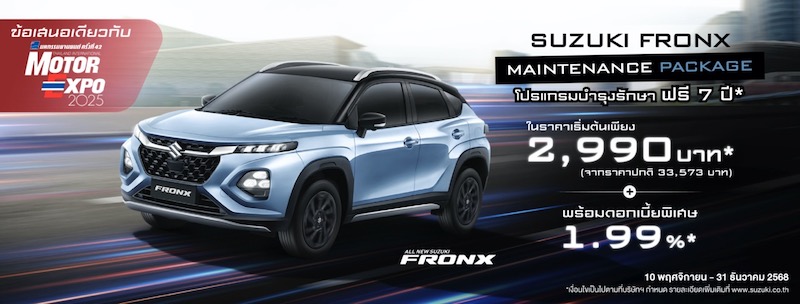 ทั้งนี้ เพื่อกระตุ้นให้เกิดการตัดสินใจเป็นเจ้าของรถยนต์สไตล์สปอร์ตเอสยูวีอย่าง ALL NEW SUZUKI FRONX ได้ง่ายยิ่งขึ้น ซูซูกิจึงขอเสนอแคมเปญพิเศษที่พร้อมจะเติมเต็มทุกความคุ้มค่าให้กับลูกค้าทุกท่านได้เหนือกว่าใคร ด้วยโปรแกรมที่มอบความมั่นใจในการครอบครองรถในระยะยาว และช่วยให้ลูกค้าสามารถวางแผนค่าใช้จ่ายได้ง่ายขึ้นในอนาคต เพราะเชื่อมั่นว่า การซื้อรถจะต้องได้ความคุ้มค่าตลอดระยะเวลาการเป็นเจ้าของ โดยไม่มีความกังวลใดๆ ตลอดการใช้งาน
