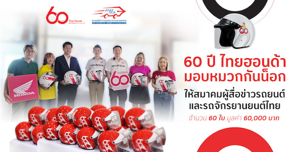 บริษัท ไทยฮอนด้า จำกัด ผู้ผลิตและจัดจำหน่ายรถจักรยานยนต์และเครื่องยนต์อเนกประสงค์ฮอนด้าในประเทศไทย เดินหน้าส่งเสริมความปลอดภัยบนท้องถนนอย่างต่อเนื่อง ในวาระครบรอบ 60 ปี ด้วยการมอบหมวกกันน็อกมาตรฐาน มอก. จำนวน 60 ใบ รวมมูลค่า 60,000 บาท ให้แก่สมาคมผู้สื่อข่าวรถยนต์และรถจักรยานยนต์ไทย (สรยท.) การมอบหมวกกันน็อกในครั้งนี้ ได้รับเกียรติจาก นายสุรศักดิ์ จรินทร์ทอง นายกสมาคมฯ เป็นผู้แทนรับมอบ ร่วมกันผลักดันการสร้างวัฒนธรรมการสวมหมวกกันน็อกให้แพร่หลายมากขึ้น อีกทั้งยังเป็นการแสดงความห่วงใยต่อสื่อมวลชนสายรถจักรยานยนต์ที่ต้องใช้รถในการปฏิบัติงาน พร้อมถ่ายทอดแนวคิดด้านความปลอดภัยสู่สังคมไทย เพื่อกระตุ้นให้ทุกคนตระหนักถึงความสำคัญของการสวมหมวกกันน็อกทุกครั้งที่เดินทาง