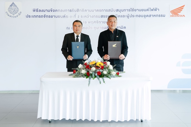 (กรุงเทพฯ – 19 พฤศจิกายน 2568) ไทยฮอนด้า ผู้ผลิตและจัดจำหน่ายรถจักรยานยนต์ และเครื่องยนต์อเนกประสงค์ฮอนด้าในประเทศไทยเข้าร่วมพิธีลงนามบันทึก “พิธีลงนามข้อตกลงการรับสิทธิตามมาตรการสนับสนุนการใช้ยานยนต์ไฟฟ้า ประเภทรถจักรยานยนต์ระยะที่ 2” ระหว่างกรมสรรพสามิตและผู้ประกอบอุตสาหกรรมอย่างเป็นทางการ เพื่อยกระดับอุตสาหกรรมยานยนต์ไฟฟ้าของประเทศไทยให้เติบโตอย่างแข็งแกร่งและยั่งยืน พร้อมทั้งผลักดันการใช้พลังงานสะอาด ลดการปล่อยคาร์บอน และขับเคลื่อนประเทศไปสู่เศรษฐกิจสีเขียว ตามวิสัยทัศน์ของฮอนด้าที่มุ่งสู่ Carbon Neutrality ภายในปี พ.ศ. 2593