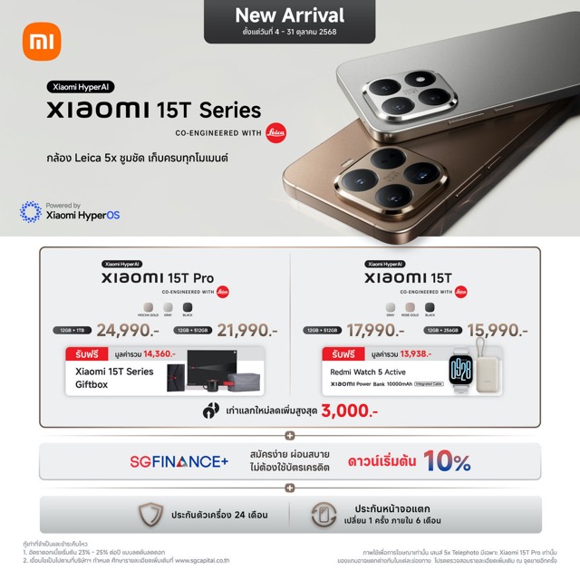 พิเศษ! สำหรับลูกค้าที่ซื้อ Xiaomi 15T ในระหว่างวันที่ 4 – 31 ตุลาคม 2568 รับฟรี Redmi Watch 5 Active, Xiaomi Power Bank 10000mAh (Integrated Cable) ประกันตัวเครื่อง 24 เดือน9 และประกันหน้าจอแตก (เปลี่ยน 1 ครั้ง ภายใน 6 เดือน)10, รวมมูลค่าของสมณาคุณ 13,938 บาท11 นอกจากนี้ยังนำเครื่องเก่ามาแลกใหม่และรับส่วนลดเพิ่มสูงสุด 2,000 บาท11