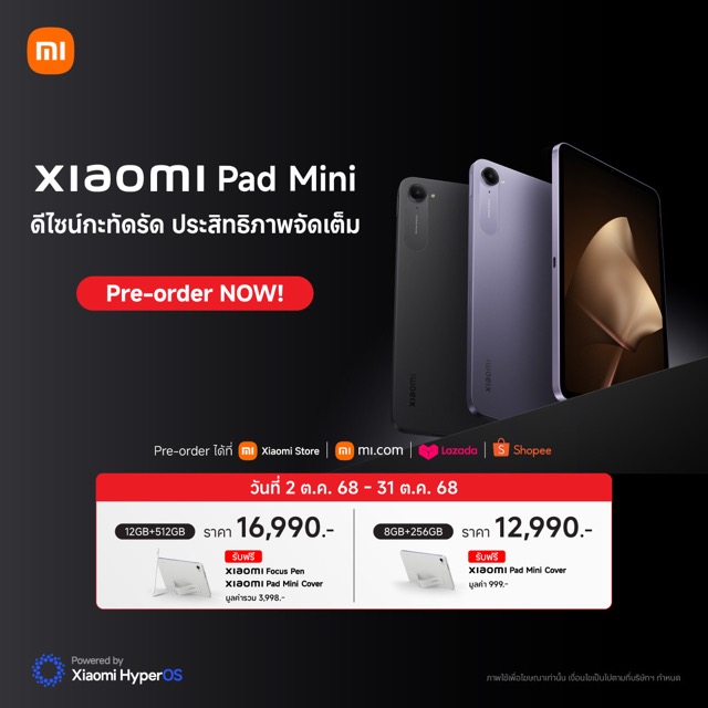 - Xiaomi Pad Mini รุ่นความจุ 12GB + 512GB พร้อมให้ลูกค้าสั่งจองล่วงหน้าตั้งแต่วันนี้ถึง 31 ตุลาคม 2568 โดยวางจำหน่ายในราคา 16,990 บาท เฉพาะที่ Xiaomi Store สาขา สยามพารากอน, สาขาเดอะมอลล์ ไลฟ์สโตร์ งามวงศ์วาน, สาขาดุสิต เซ็นทรัล พาร์ค และช่องทางการจัดจำหน่ายทางออนไลน์แพลตฟอร์ม mi.com, Shopee และ Lazada พิเศษ! สำหรับลูกค้าที่สั่งจอง Xiaomi Pad Mini รุ่นความจุ 12GB + 512GB ตั้งแต่วันนี้ถึง 31 ตุลาคม 2568 รับฟรี Xiaomi Focus Pen และ Xiaomi Pad Mini Cover มูลค่า 3,998 บาท11